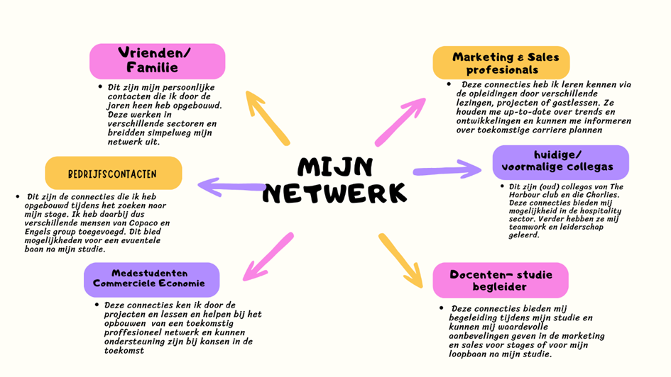 Op de afbeelding zie je een mindmap van mijn huidige connecties. Dit zijn de connecties waar ik zelf veelal gebruik van maak bij bijvoorbeeld het zoeken naar mijn stage. Via deze afbeelding vind je mijn netwerk terug in een oogopslag.