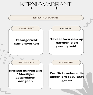 Ik werk heel goed samen en haal daar veel plezier uit. Een valkuil voor mij is dat ik soms te veel focus op de gezelligheid, waardoor het project op de achtergrond raakt en er minder gedaan wordt. Mijn uitdaging is om wat kritischer te zijn en mezelf en anderen weer aan het werk te zetten, maar daar heb ik soms moeite mee. Wat ik echt niet kan uitstaan, zijn strebers die alleen maar gericht zijn op resultaat en daardoor conflicten veroorzaken. Dat zorgt voor een negatieve sfeer en dat vind ik vervelend.